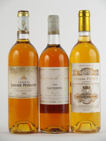 3 BOUTEILLES SAUTERNES : 1 CHÂTEAU FILHOT CC 1992 - 1 LAFAURIE PEYRAGUEY 1er CC 1996 ELA - 1 CHÂTEAU DE VEYRES 1989