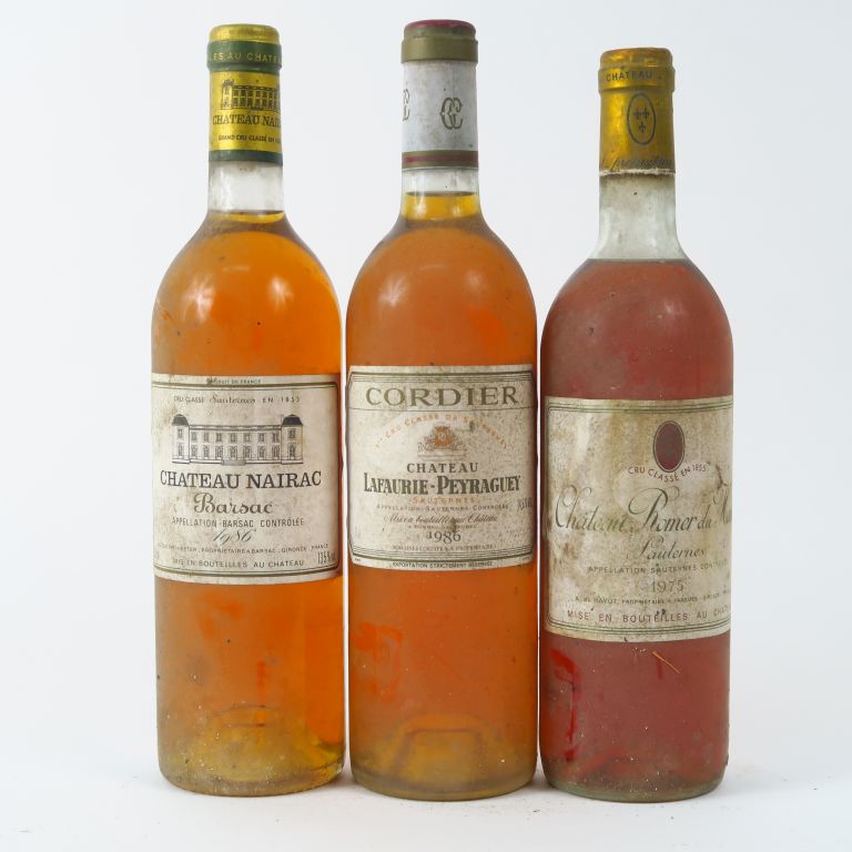 3 BOUTEILLES SAUTERNES : 1 CHÂTEAU LAFAURIE PEYRAGUEY 1er CC 1986 - 1 CHÂTEAU ROMER DU HAYOT 1975 LB - 1 CHÂTEAU NAIRAC 1986