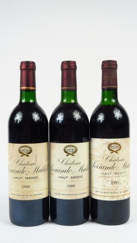 Lot de 3 BOUTEILLES SOCIANDO MALLET HAUT MEDOC : 2 de 1989 BG - 1 de 1995 LB- au prix de 80 à 90 € en vente aux enchères par l'hôtel des ventes Primardeco