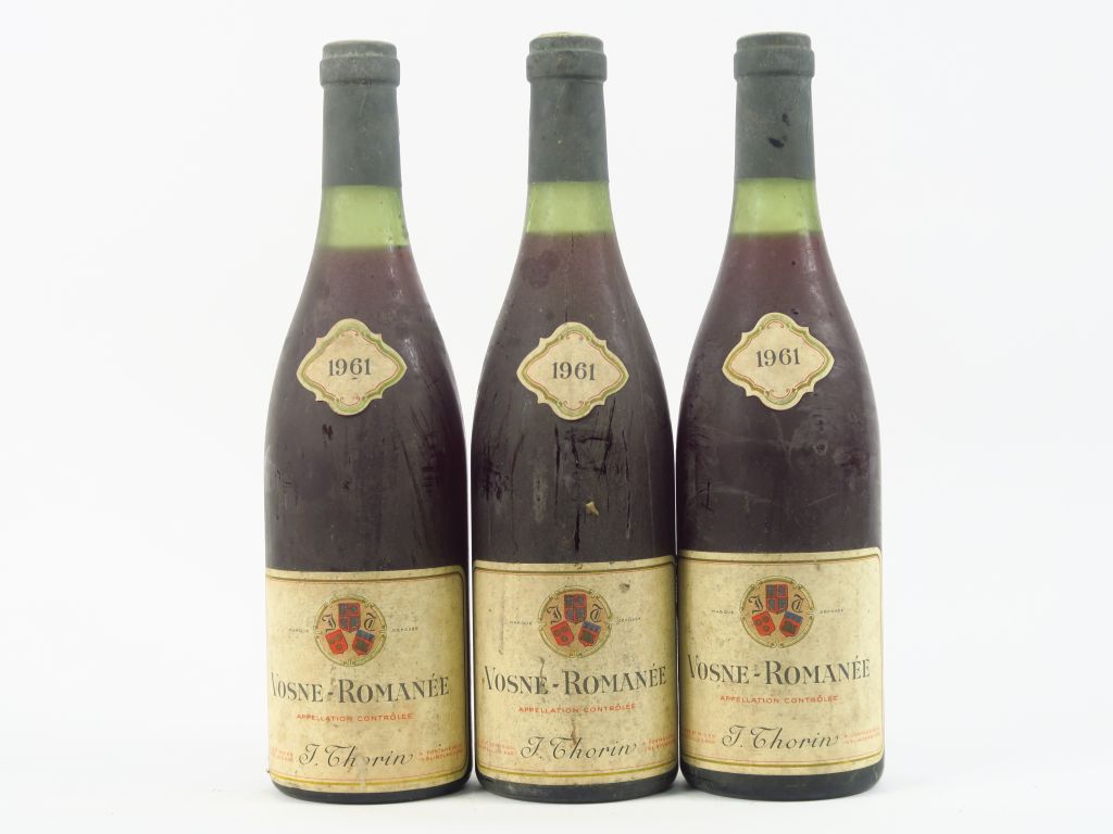 Lot de 3 BOUTEILLES VOSNE ROMANEE J. THORIN - 1961 - 2 à 2,5 CM/3 CM au prix de 280 à 300 € en vente aux enchères par l'hôtel des ventes Primardeco