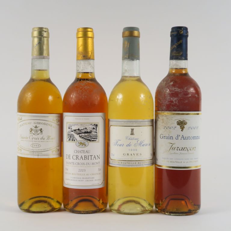 4 BOUTEILLES : 1 CHÂTEAU DE CRABITAN STE CROIX DU MONT 2003 - 1 CHÂTEAU GIRODINEAU STE CROIX DU MONT 1998 - 1 CHÂTEAU TOUR DE MARON GRAVES 1996 - 1 GRAIN D'AUTOMNE JURANCON 2002