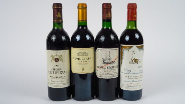 4 BOUTEILLES : 1 CHÂTEAU DE FIEUZAL CC GRAVES 1989 BG - 1 CONNETABLE TALBOT 1997 - 1 CHÂTEAU BEYCHEVELLE GCC ST JULIEN 1988 BG+ - 1 CHÂTEAU MOUTON BARONNE PHILIPPE GCC PAUILLAC 1984 LB