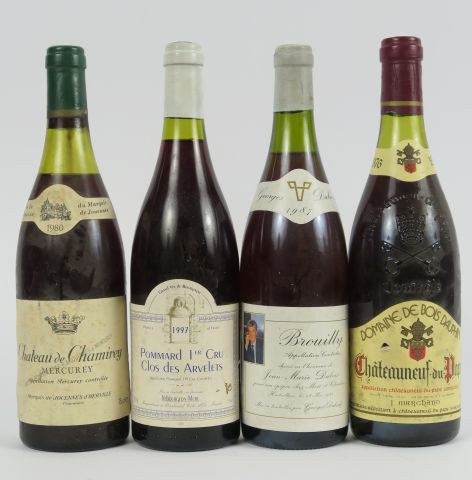 4 BOUTEILLES : 1 POMMARD 1er CRU 'CLOS DES ARVELETS' 1997 - 1 CHÂTEAUNEUF DU PAPE DOMAINE DE BOIS DAUPHIN 1976 - 1 MERCUREY CHÂTEAU DE CHAMIREY 1980 - 1 BROUILLY G. DUBOEUF 1987