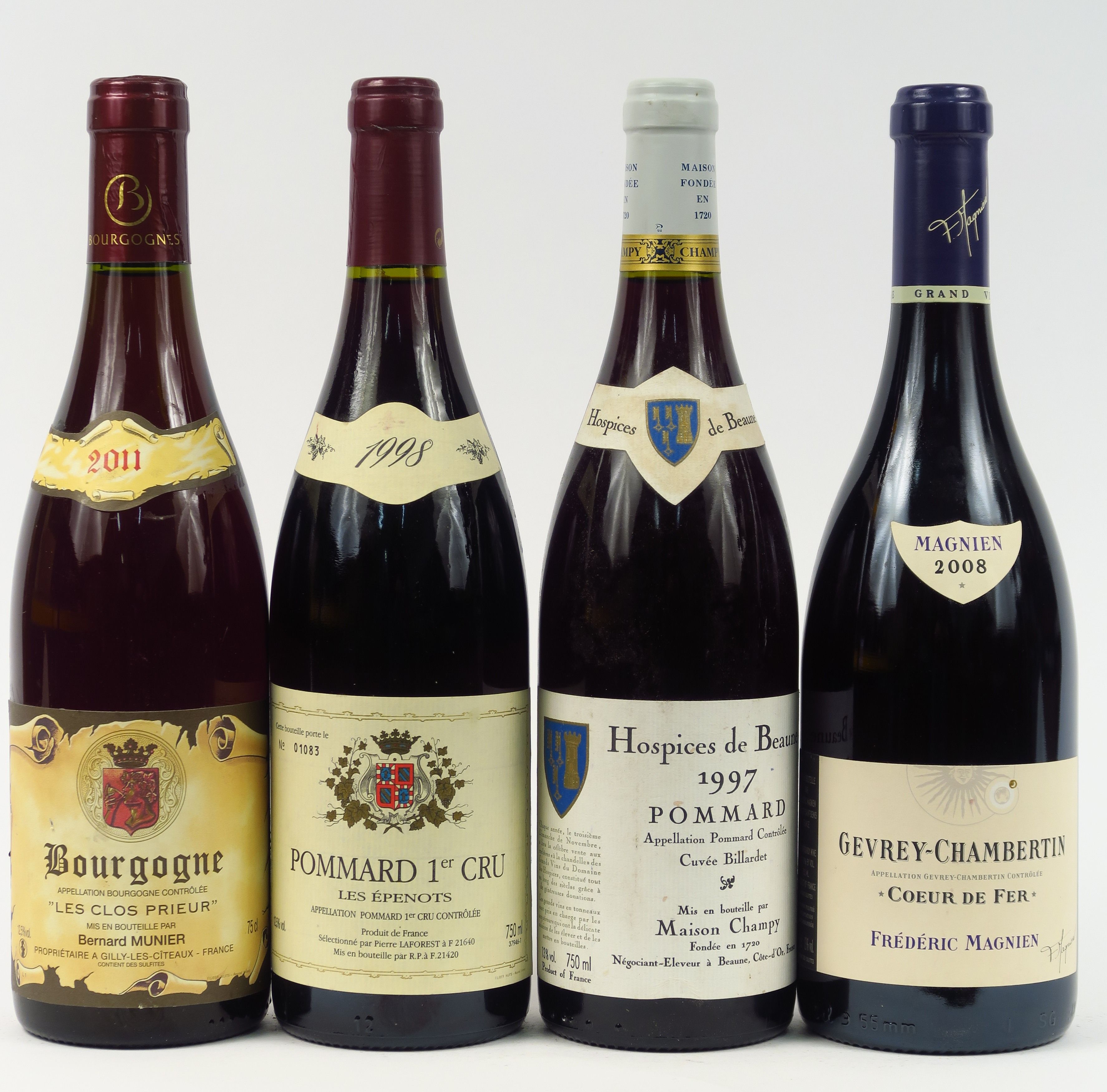 4 BOUTEILLES : 1 POMMARD 'CUVEE BILLARDET' HOSPICES DE BEAUNE CHAMPY 1997 - 1 POMMARD 1er CRU 'LES EPENOTS' P. LAFOREST 1998 - 1 GEVREY CHAMBERTIN 'CŒUR DE FER' F. MAGNIEN 2008 - 1 BOURGOGNE 'LES CLOS PRIEUR' B. MUNIER 2011