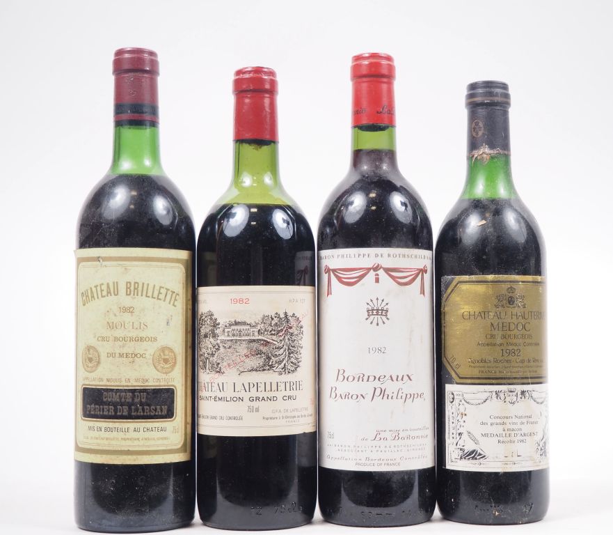 4 BOUTEILLES 1982 : 1 CHÂTEAU BRILLETTE CB MOULIS - LB / 1 CHÂTEAU LAPELLETRIE GC ST ÉMILION - MEP / 1 BARON PHILIPPE / 1 CHÂTEAU HAUTERIVE CB MÉDOC - LB