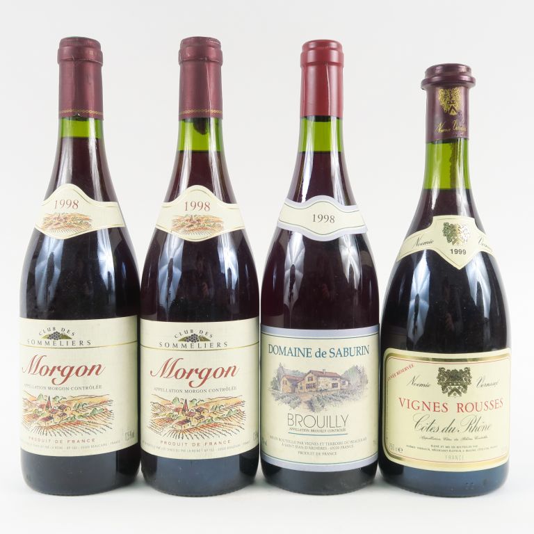 Lot de 4 BOUTEILLES : 2 MORGON 1998 - 1 BROUILLY 1998 - 1 CÔTES DU RHÔNE 1999 au prix de 25 à 35 € en vente aux enchères par l'hôtel des ventes Primardeco