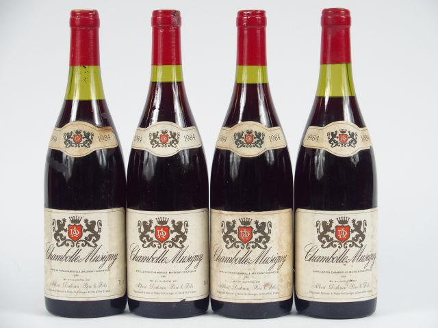 Lot de 4 BOUTEILLES CHAMBOLLE MUSIGNY A. DABRUN - 1984 - 2 à 2 CM/2 à 3 CM/ET au prix de 80 à 90 € en vente aux enchères par l'hôtel des ventes Primardeco
