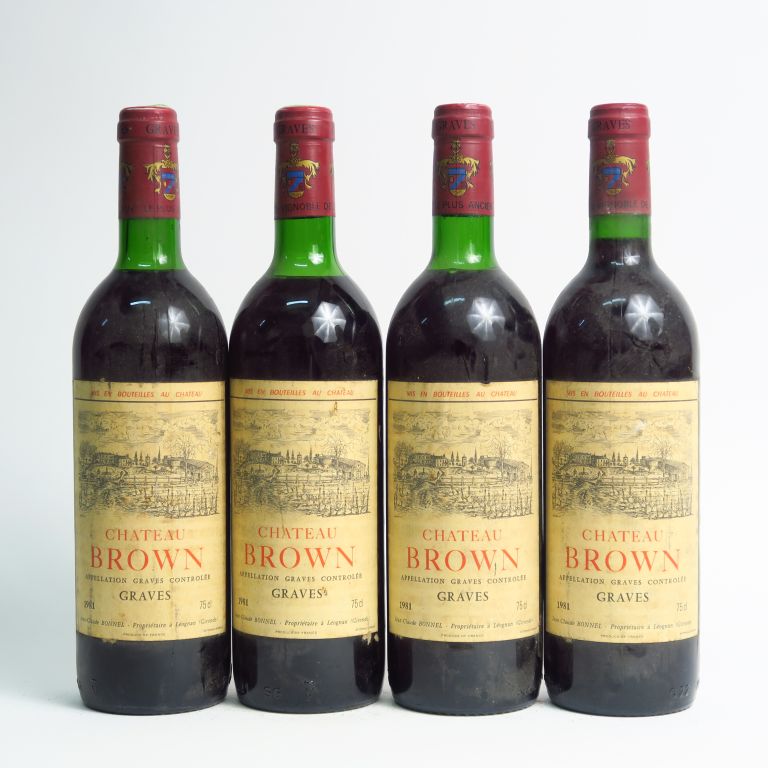 Lot de 4 BOUTEILLES CHÂTEAU BROWN GRAVES - 1981 - 2 LB/1 HEP au prix de 35 à 45 € en vente aux enchères par l'hôtel des ventes Primardeco