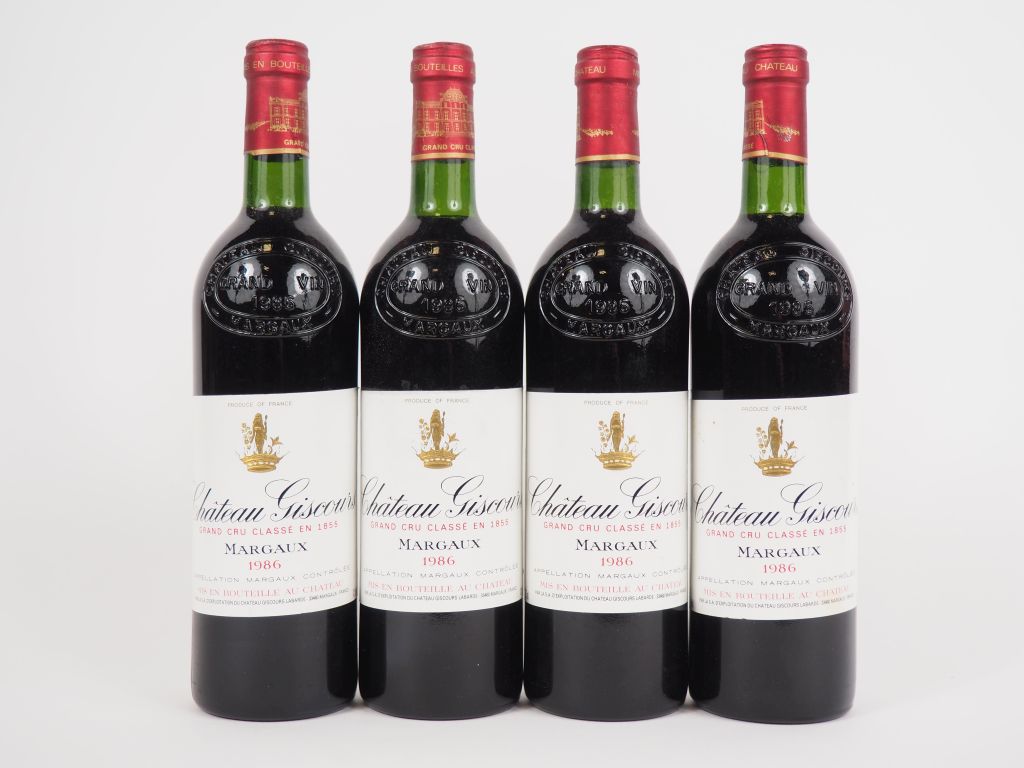 Lot de 4 BOUTEILLES CHÂTEAU GISCOURS GCC MARGAUX - 1986 - CBO - BG au prix de 80 à 90 € en vente aux enchères par l'hôtel des ventes Primardeco