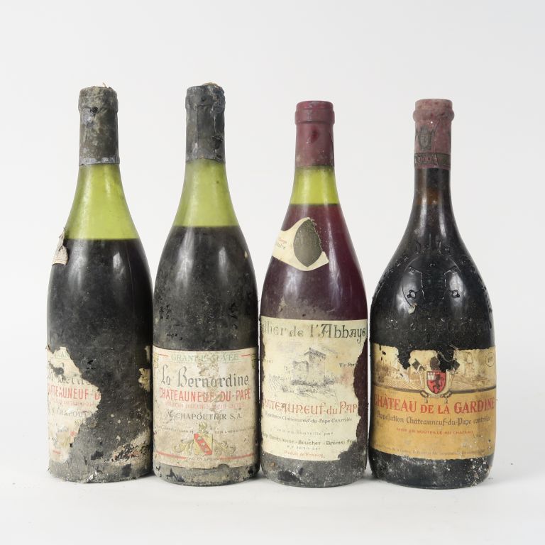 4 BOUTEILLES CHATEAUNEUF DU PAPE : 1 CHÂTEAU DE LA GARDINE 1973 EA - 1 CELLIER DE L'ABBAYE NM/EA - 2 'BERNARDINE' GRANDE CUVÉE M. CHAPOUTIER EA 5.5 CM/6 CM