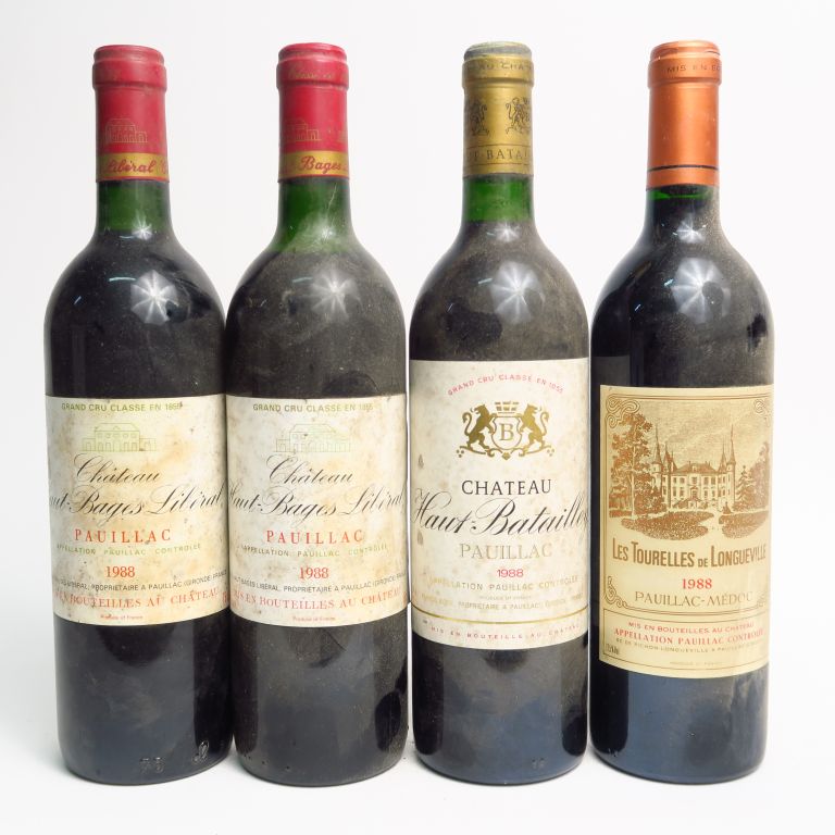 4 BOUTEILLES PAUILLAC 1988 : 2 CHÂTEAU HAUT BAGES LIBERAL GCC 1 BG/1 HEP - 1 LES TOURELLES DE LONGUEVILLE - 1 CHÂTEAU HAUT BATAILLEY 1988