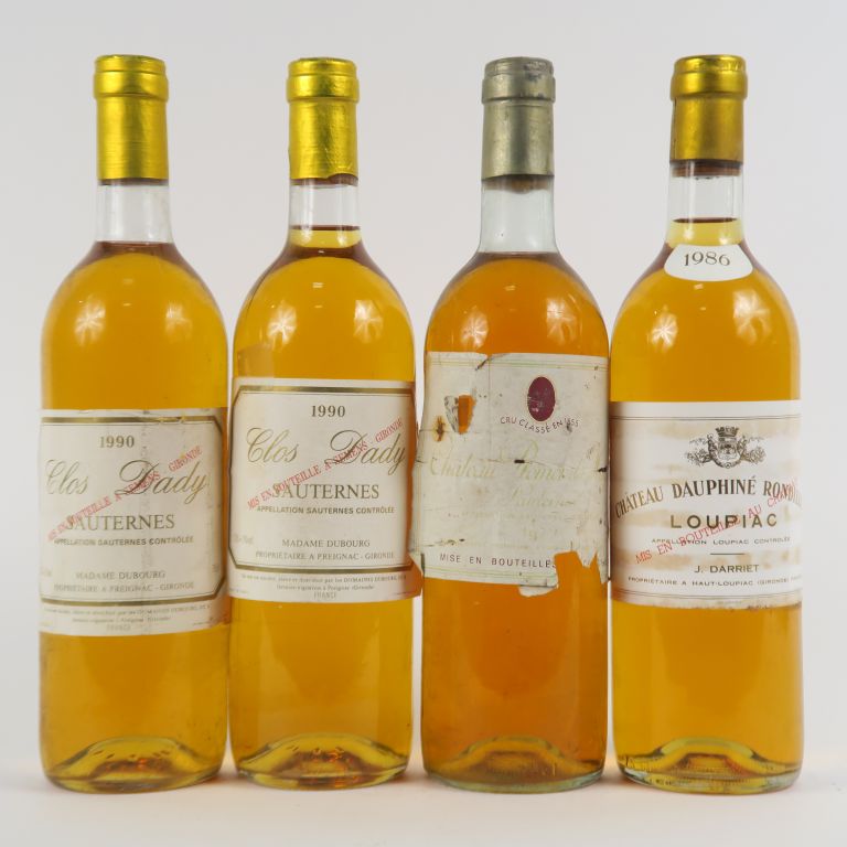 4 BOUTEILLES SAUTERNES : 2 CLOS DADY 1990 - 1 CHÂTEAU ROMER DU HAYOT CC 1979 BG/EA - 1 CHÂTEAU DAUPHINÉ ROUDILLON 1986 BG