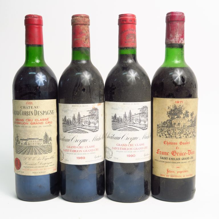 4 BOUTEILLES ST EMILION : 1 CHÂTEAU GRAND CORDIN DESPAGNE GCC 1988 HEP - 1 CHÂTEAU CROQUE MICHOTTE GCC 1989 BG - 1 CHÂTEAU CROQUE MICHOTTE GCC 1990 - 1 CHÂTEAU GUADET FRANC GRÂCE DIEU GC 1971 HEP