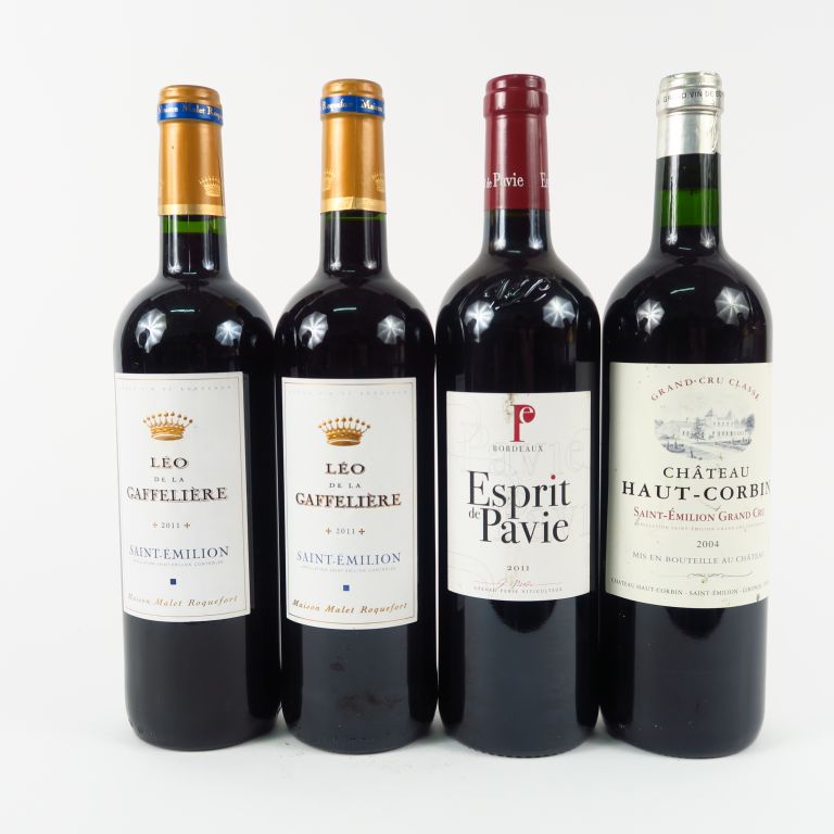 4 BOUTEILLES ST EMILION : 1 ESPRIT DE PAVIE 2011 - 1 CHÂTEAU HAUT CORBIN GC 2004 - 2 LEO DE LA GAFFELIERE 2011