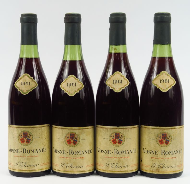 Lot de 4 BOUTEILLES VOSNE ROMANEE J. THORIN - 1961 - 1,5 CM/2 CM/2,5 CM/3 CM/ au prix de 700 à 900 € en vente aux enchères par l'hôtel des ventes Primardeco
