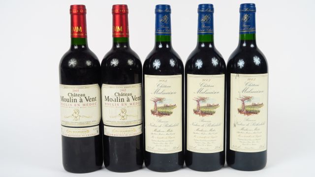 Lot de 5 BOUTEILLE MOULIS : 2 CHÂTEAU MOULIN A VENT 2005 - 3 CHÂTEAU MALMAISO au prix de 70 à 80 € en vente aux enchères par l'hôtel des ventes Primardeco