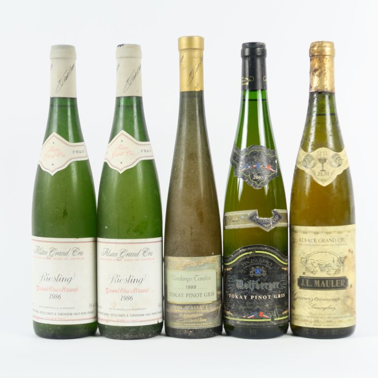 5 BOUTEILLES: 2 RIESLING GC BRAND 1986 - 2 TOKAY PINOT GRIS (1 V.T. 1988/1 WOLFBERGER 2003) - 1 GEWURZTRAMINER 'SONNENGLAZ' MAULER 1997