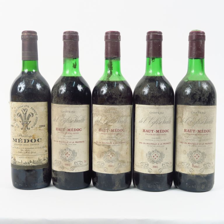 5 BOUTEILLES : 4 CHÂTEAU DE L'EGLISE VIEILLE HAUT MEDOC 1985 2 HEP/2 MEP - 1 MEDOC PRESTIGE 1982 BG