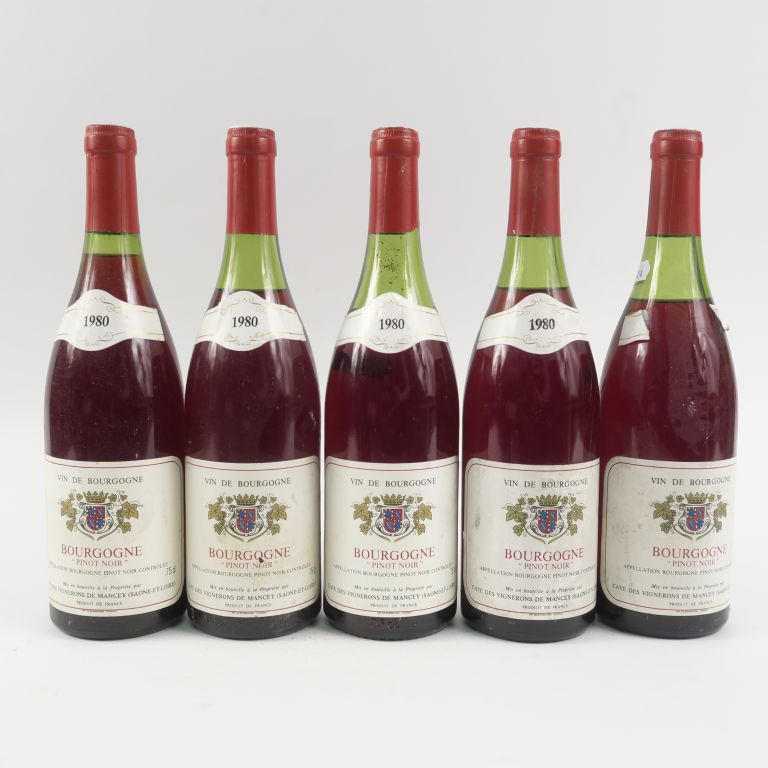5 BOUTEILLES BOURGOGNE PINOT NOIR VIGNERONS DE MANCEY - 1980 - 1 PRÉSUMÉE - 1.5 CM/2 à 3.5 CM/4 CM/5 CM