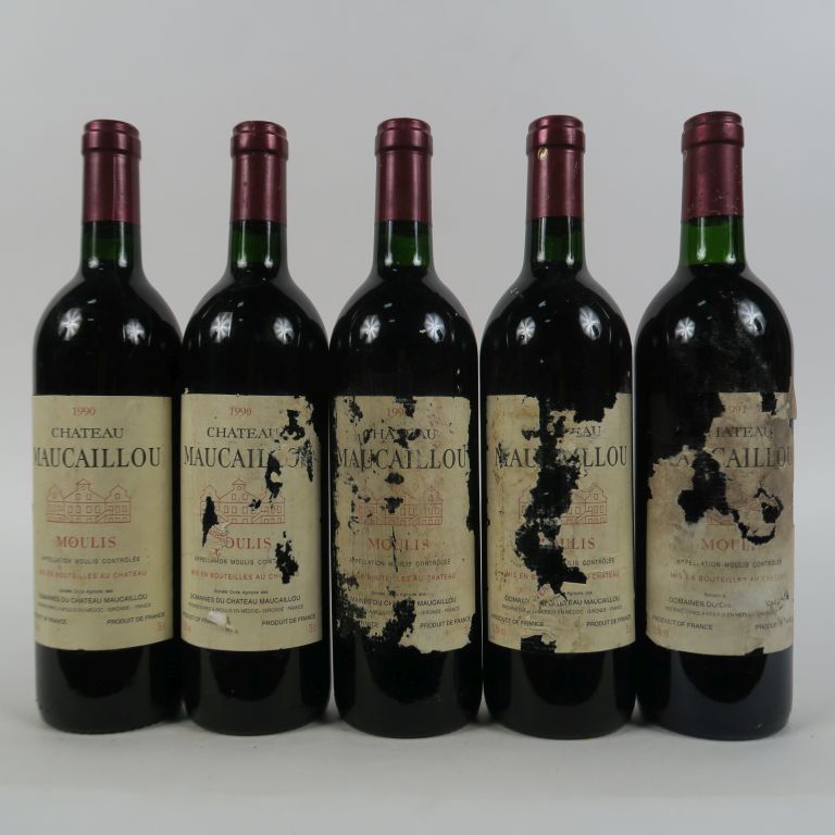 Lot de 5 BOUTEILLES CHÂTEAU MAUCAILLOU MOULIS : 4 de 1990 3 EA -1 de 1991 EA/ au prix de 70 à 80 € en vente aux enchères par l'hôtel des ventes Primardeco