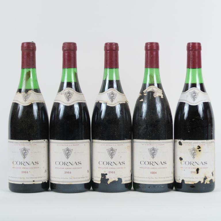 Lot de 5 BOUTEILLES CORNAS CAVE DE TAIN L'HERMITAGE - 1984 - 1 à 4 CM/2 ELA au prix de 40 à 50 € en vente aux enchères par l'hôtel des ventes Primardeco