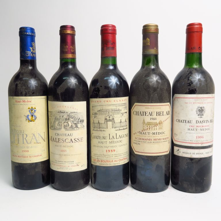 5 BOUTEILLES HAUT MEDOC : 1 CHÂTEAU LA LAGUNE GCC 1989 - 1 CHÂTEAU CITRAN CB 1990 - 1 CHÂTEAU MALESCASSE CB 1995 - 1 CHÂTEAU BEL AIR 1988 BG - 1 CHÂTEAU DASVIN BEL AIR CB 1996 LB