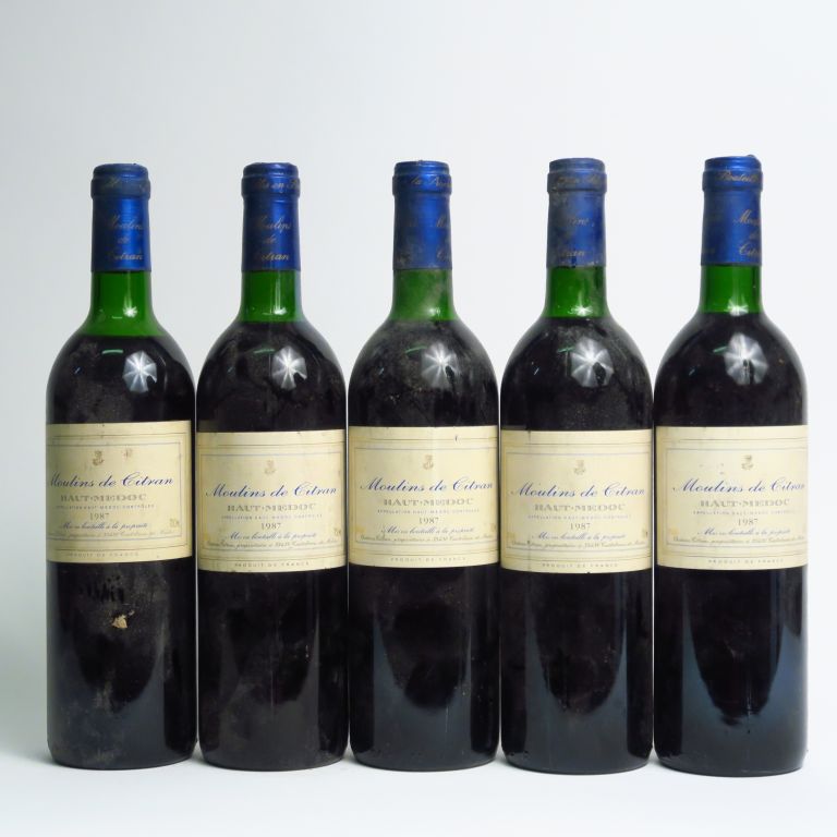 Lot de 5 BOUTEILLES MOULINS DE CITRAN HAUT MEDOC - 1987 - 3 LB/2 HEP au prix de 40 à 50 € en vente aux enchères par l'hôtel des ventes Primardeco