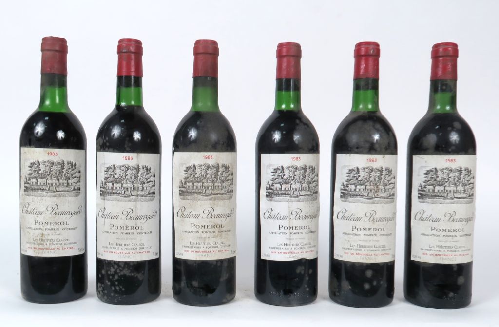 Lot de 6 BOUTEILLES CHÂTEAU BEAUREGARD POMEROL - 1983 - 2 BG/3 LB au prix de 80 à 90 € en vente aux enchères par l'hôtel des ventes Primardeco