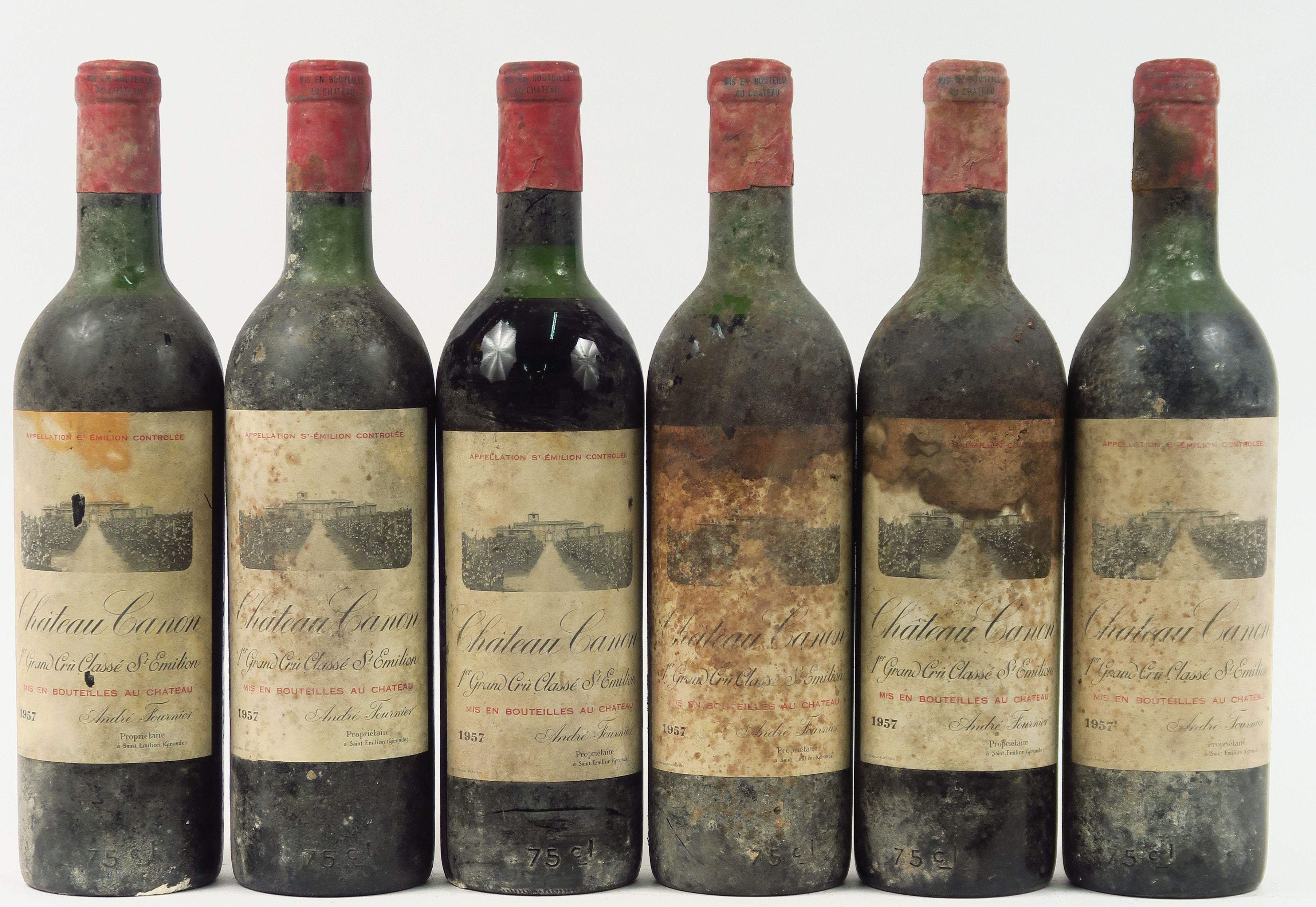 6 BOUTEILLES CHÂTEAU CANON 1er GCC ST EMILION - 1957 - 1 LB/2 HEP/3 MEP/EA/3 CAPS L CORRODEES