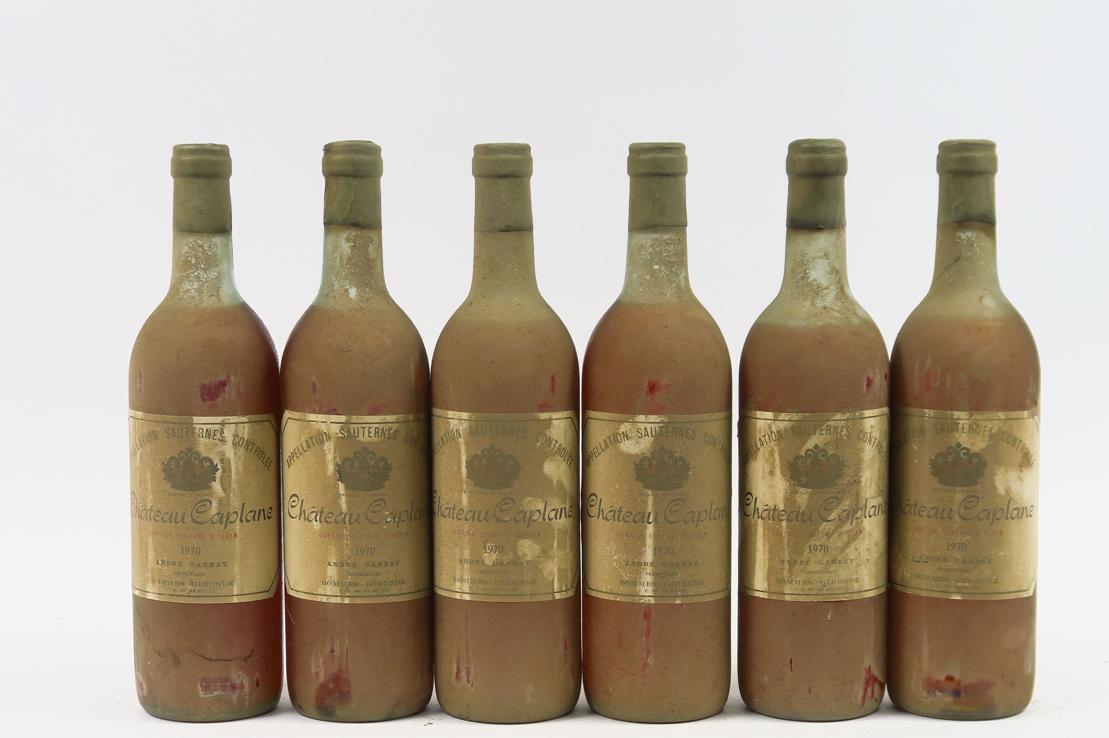 Lot de 6 BOUTEILLES CHÂTEAU CAPLANE SAUTERNES - 1970 - 3 HEP/3 MEP/BS au prix de 50 à 60 € en vente aux enchères par l'hôtel des ventes Primardeco