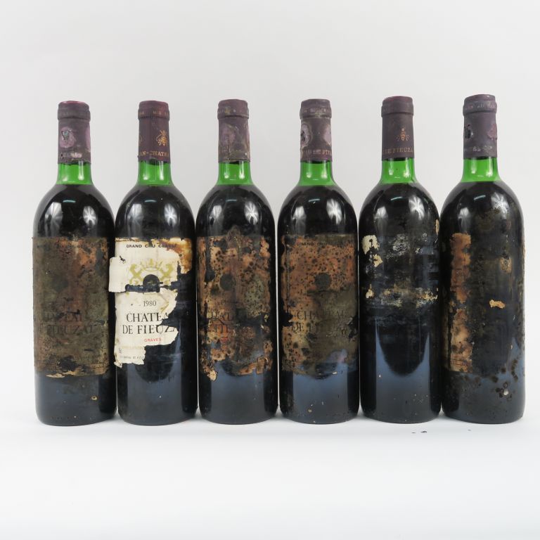 Lot de 6 BOUTEILLES CHÂTEAU DE FIEUZAL GCC GRAVES - 1980 - LB/ETA/2 PRESUMEES au prix de 80 à 90 € en vente aux enchères par l'hôtel des ventes Primardeco