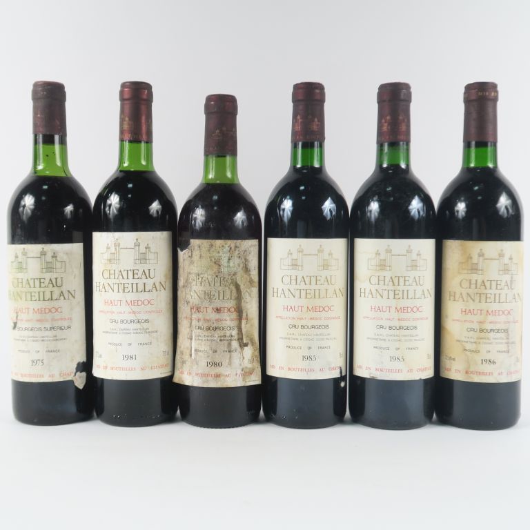 6 BOUTEILLES CHÂTEAU HANTEILLAN HAUT MÉDOC : 1 de 1975 LB - 1 de 1980 ET - 1 de 1981 EA - 2 de 1985 - 1 de 1986 ET