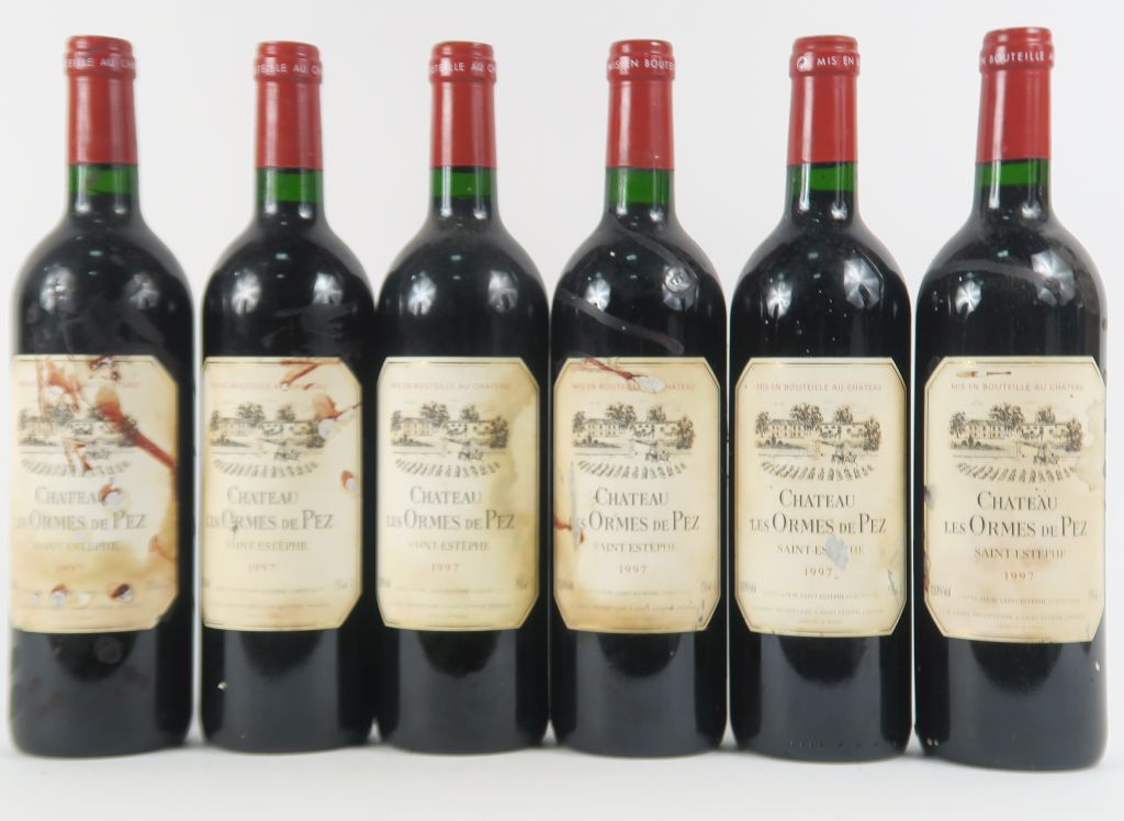Lot de 6 BOUTEILLES CHÂTEAU LES ORMES DE PEZ ST ESTEPHE - 1997 - ET/EA au prix de 80 à 90 € en vente aux enchères par l'hôtel des ventes Primardeco