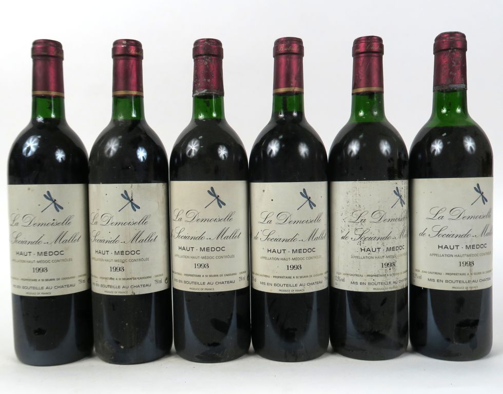 Lot de 6 BOUTEILLES LA DEMOISELLE DE SOCIANDO MALLET - 1993 - 2 BG/1 LB/1 HEP au prix de 80 à 90 € en vente aux enchères par l'hôtel des ventes Primardeco