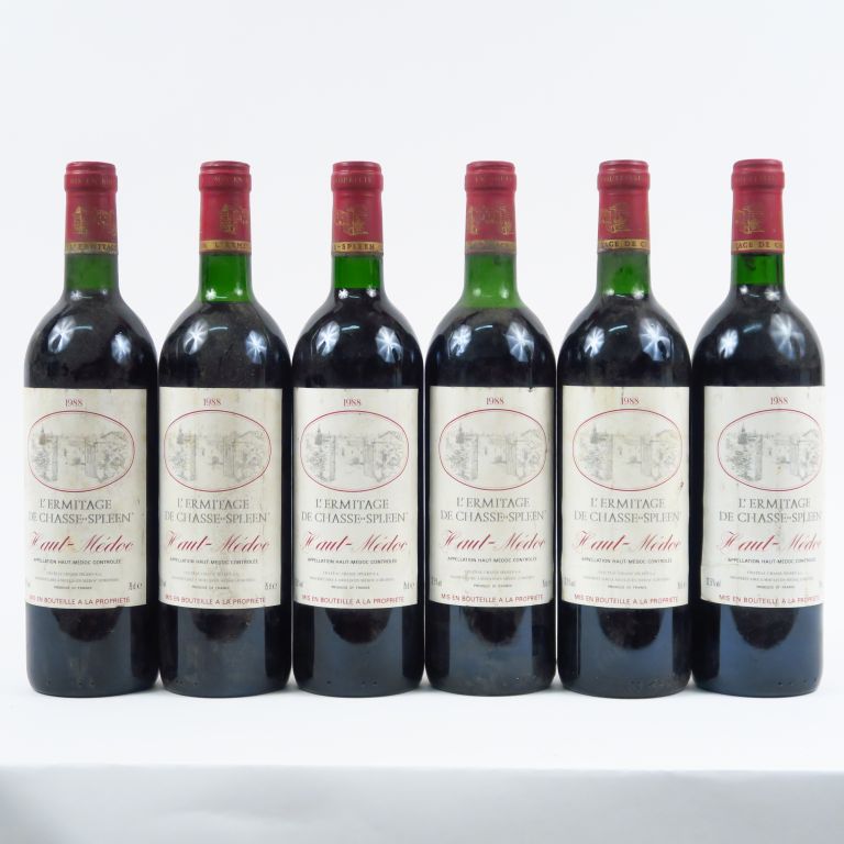 Lot de 6 BOUTEILLES L'ERMITAGE DE CHASSE SPLEEN HAUT MEDOC - 1988 - 5 BG/1 HE au prix de 60 à 80 € en vente aux enchères par l'hôtel des ventes Primardeco