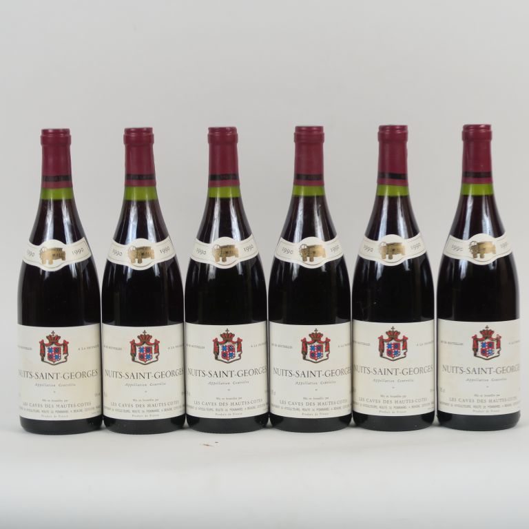 Lot de 6 BOUTEILLES NUITS ST GEORGES LES CAVES DE HAUTES COTES - 1990 au prix de 130 à 140 € en vente aux enchères par l'hôtel des ventes Primardeco