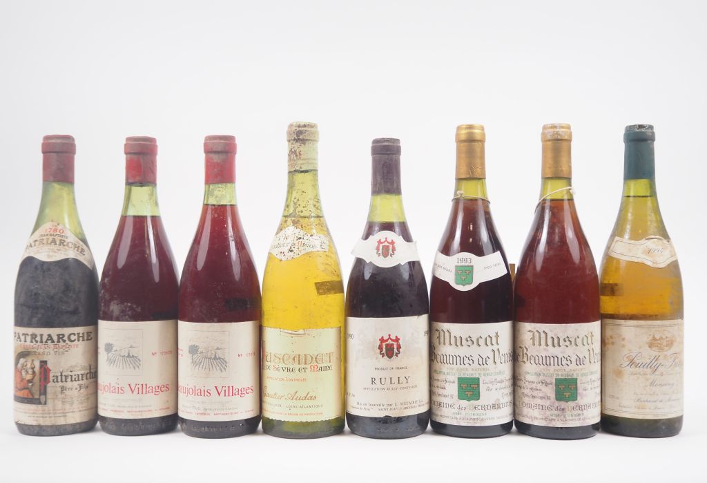 8 BOUTEILLES : 1 PATRIARCHE CUVÉE JEAN BAPTISTE / 2 BEAUJOLAIS VILLAGES - 1970 / 1 MUSCADET DE SÈVRE ET MAINE BLANC G. AUDAS - 1971 / 1 RULLY L. MÉTAIRE - 1990 / 2 MUSCAT DES BEAUMES DE VENISE DOMAINE DES BERNARDINS - 1993 / 1 POUILLY FUISSÉ MONCENY - 1994 - ES