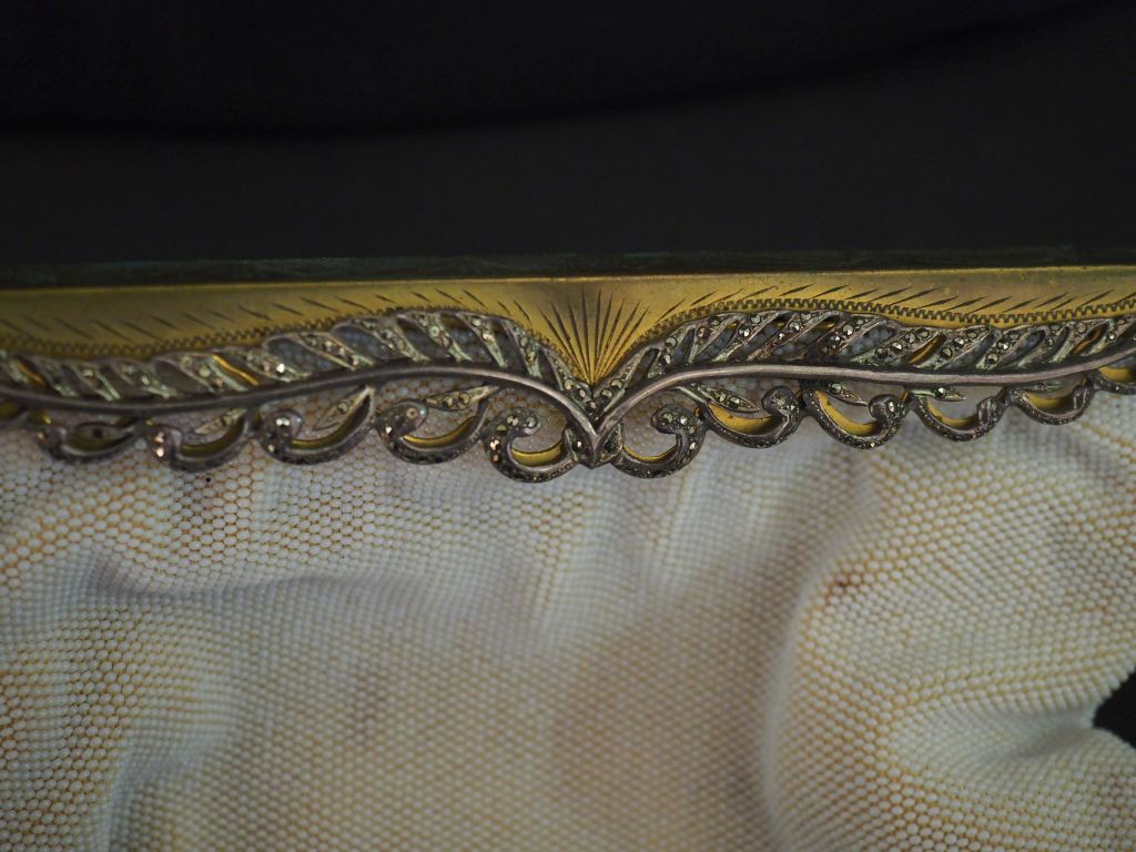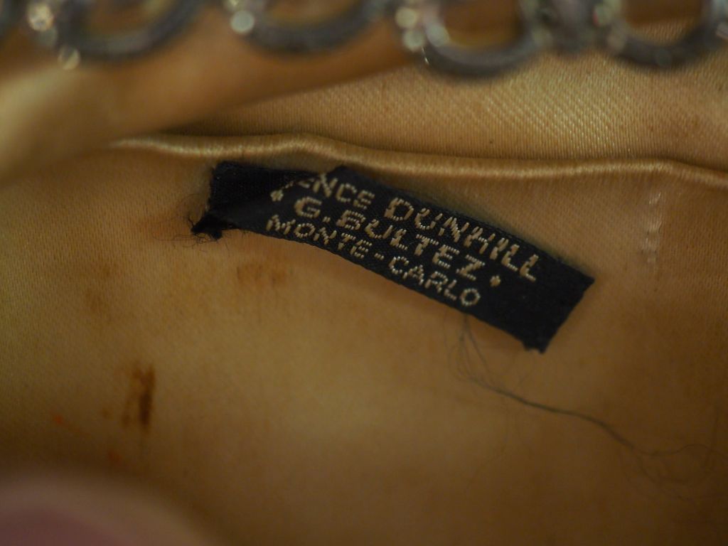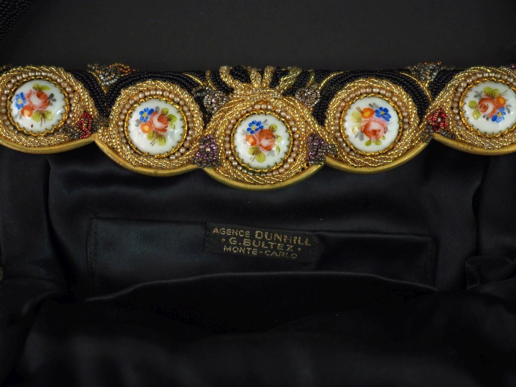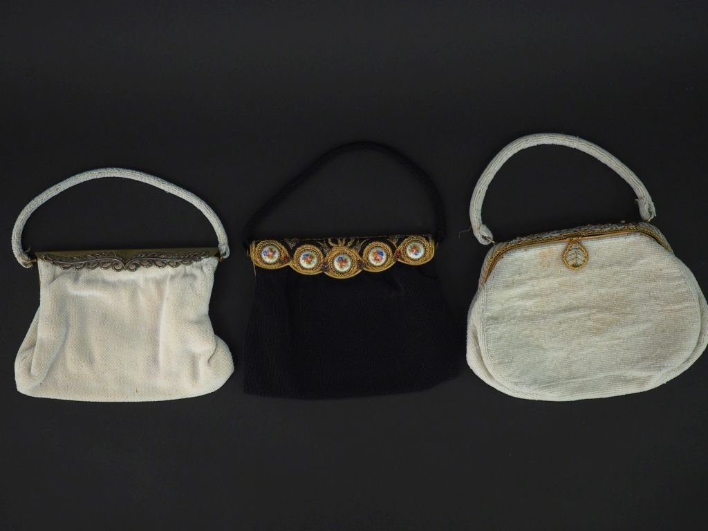 AGENCE DUNHILL "G.BULTEZ", Monte - Carlo, Trois différentes minaudières en perles. L'une agrémentée d'émail noir, une autre de cinq médaillons émaillés, à décor de fleurs et la dernière de pierres à l'imitation du diamant. (petites taches et usures, petits manques)