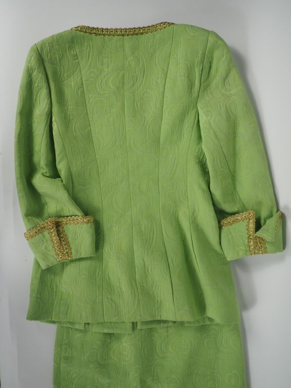 ALIMIA, Paris Ensemble de tailleur, veste et jupe, vert pomme, à décor d'arabesques et de fleurs. La veste agrémentée de galons dorés et de pompons. Fermeture à l'avant par boutons pression. Jupe à fente à l'arrière, fermeture par zip. Taille présumée. 36/38 (étiquette de la jupe manquante, pas d'étiquette indiquant la composition et la taille, petites tâches)