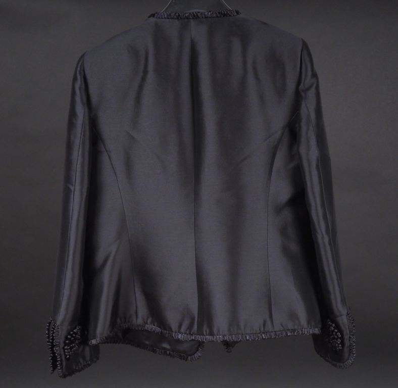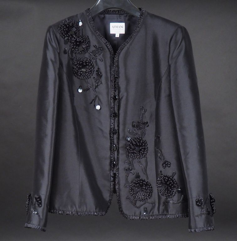 ARMANI COLLEZIONI Veste noire à col rond, à décor de broderies de fleurs noires, en laine et soie. Fermeture par cinq boutons. Broderies aux extrémités des manches. Doublure en polyester. Taille 48. (manque un sequin)