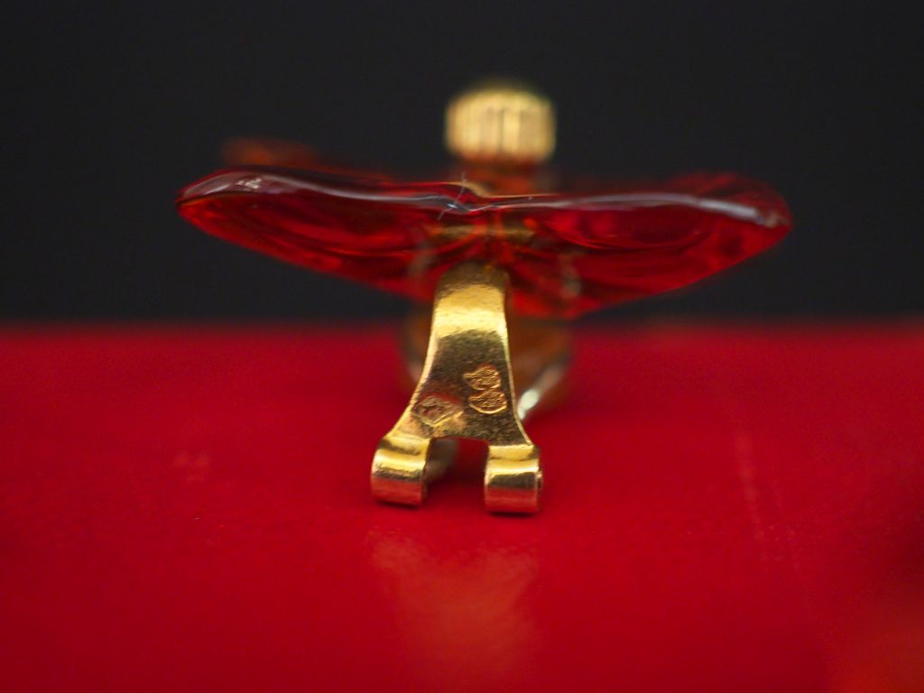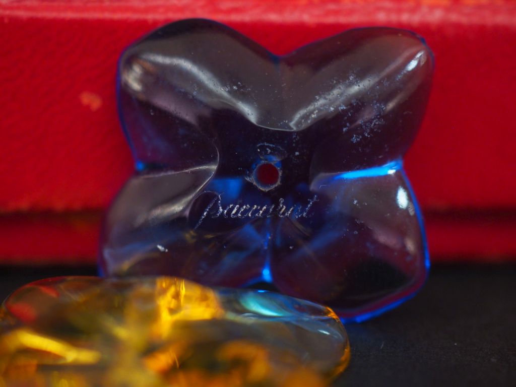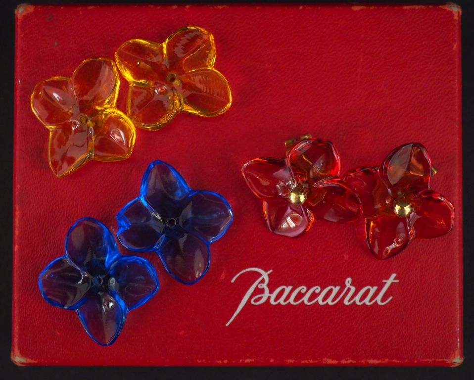 BACCARAT Trois paires de clips d'oreilles en cristal, collection "Hortensia". Le cœur en or 18k se visse et se dévisse, permettant ainsi de changer les fleurs. Signés. Dans leur boite. (égrenure à deux fleurs)