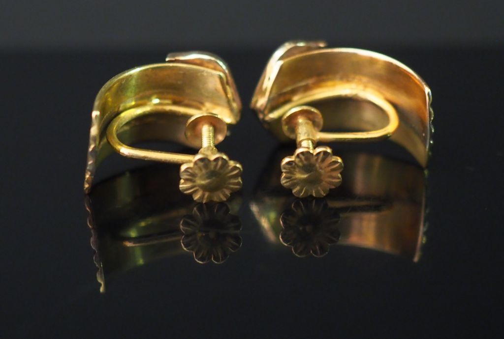 CARTIER (dans le goût de) Paire de clips d’oreilles trois tons d’or, à décor de C. Poids. 6.47 g