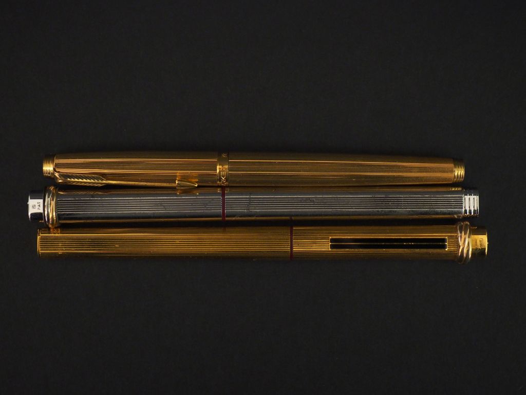 CARTIER Ensemble comprenant deux stylos plume, à décor de cannelures. L'un en plaqué or. Signés. On y joint un stylo plume PARKER en métal doré ou plaqué or. Plume en or jaune 14k. Signé. (accidenté)