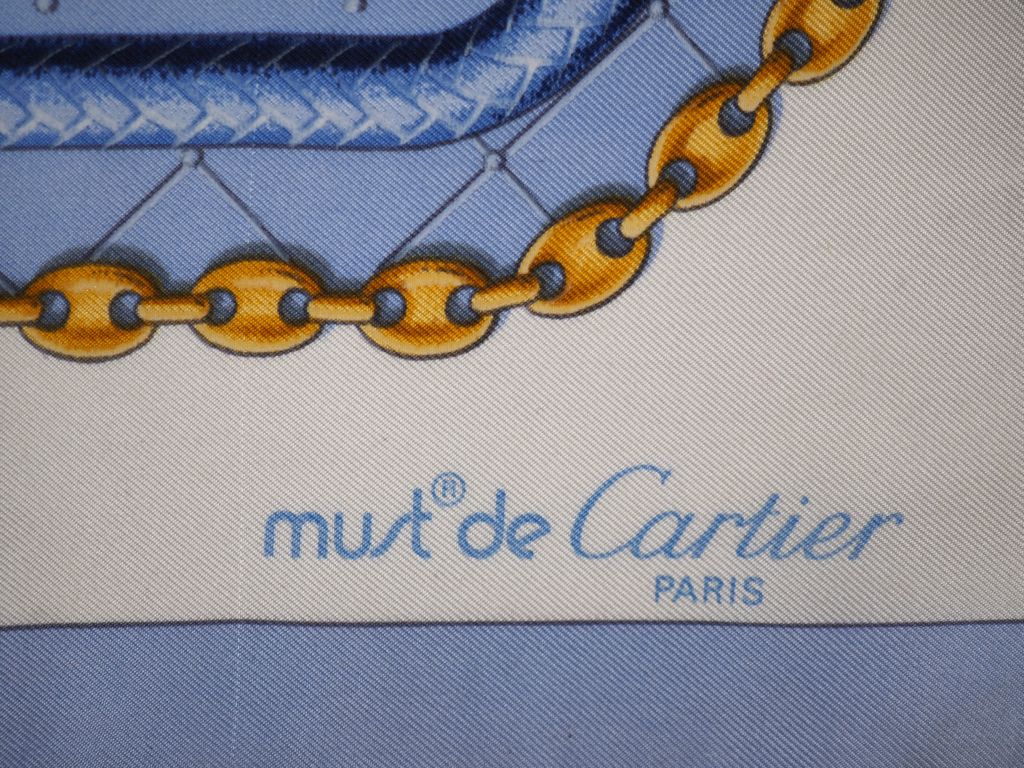 CARTIER, Must Foulard probablement en soie, à dominante bleu et or sur fond blanc. Signé.