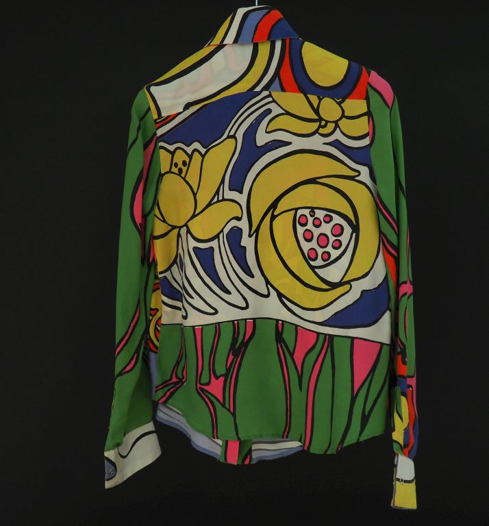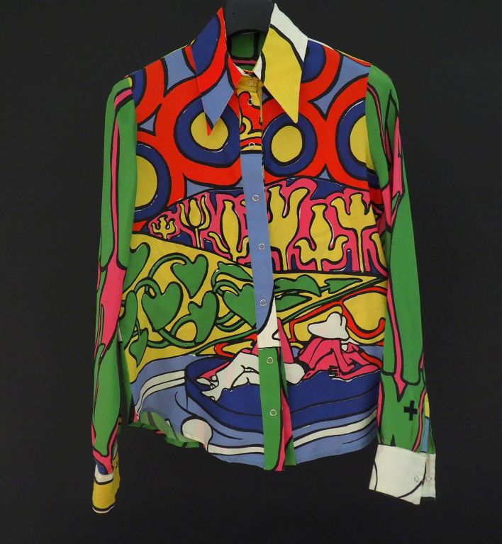 CASTELBAJAC, Legend Chemisier en soie (100%) polychrome, à décor d'une jeune femme lisant. Fermeture à l'avant et sur les manches par boutons pressions. Taille supposée. 40 (petites usures au col)