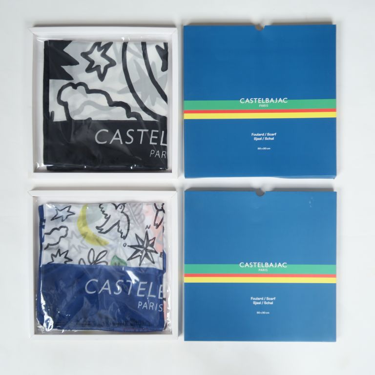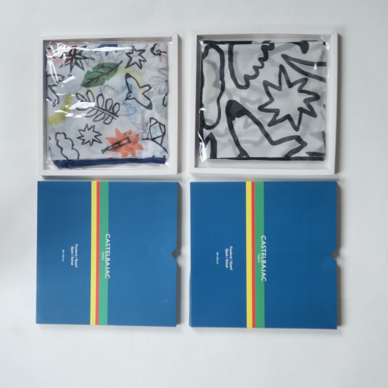 CASTELBAJAC, Paris Ensemble comprenant : - un foulard en polyester (100%), à décor polychrome et noir sur fond blanc de motifs divers. 90 x 90 cm Signé. Dans sa boite en carton. - un foulard en polyester (100%), à décor de motifs noirs sur fond blanc. 90 x 90 cm Signé. Dans sa boite en carton.