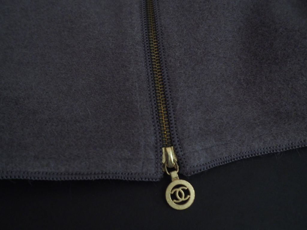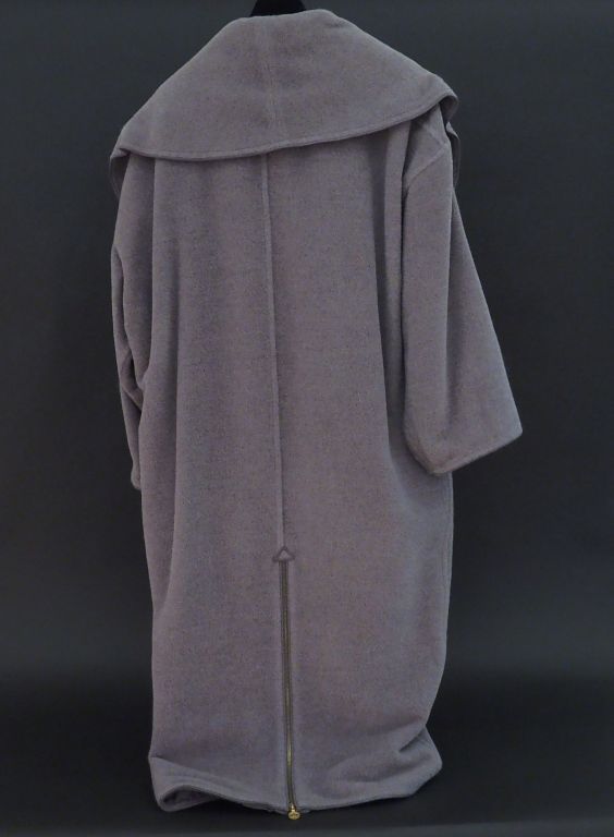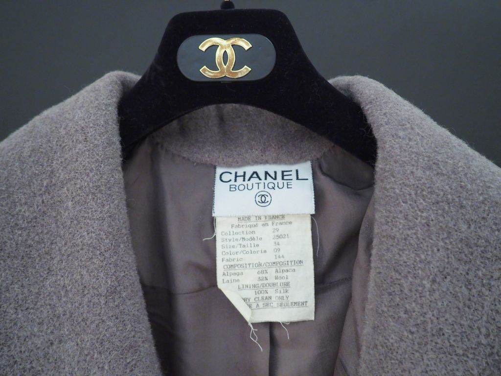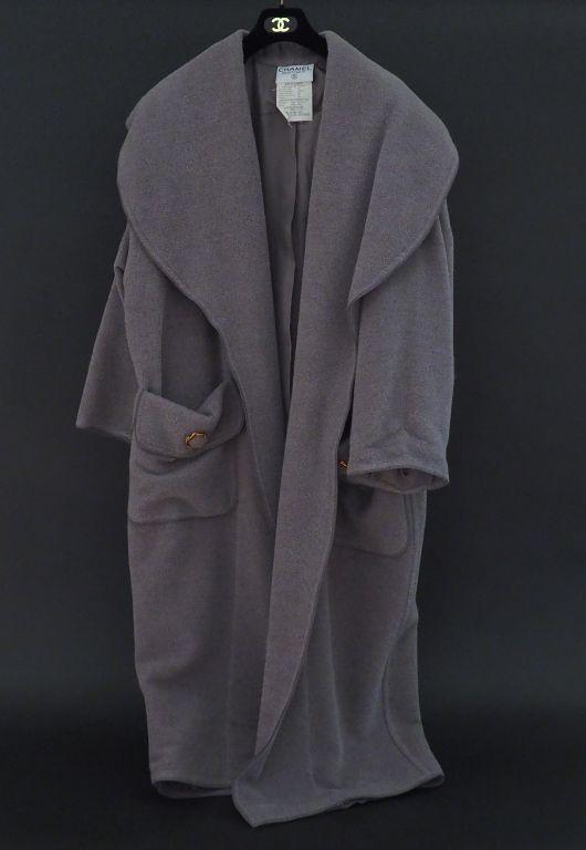 CHANEL Ample manteau gris en alpaca (68%) et laine (32%). Important col châle, sans boutonnage. Deux poches à l’avant à revers boutonnés. Fente zippée dans le dos. Collection 29. Modèle 25021. Taille 34.