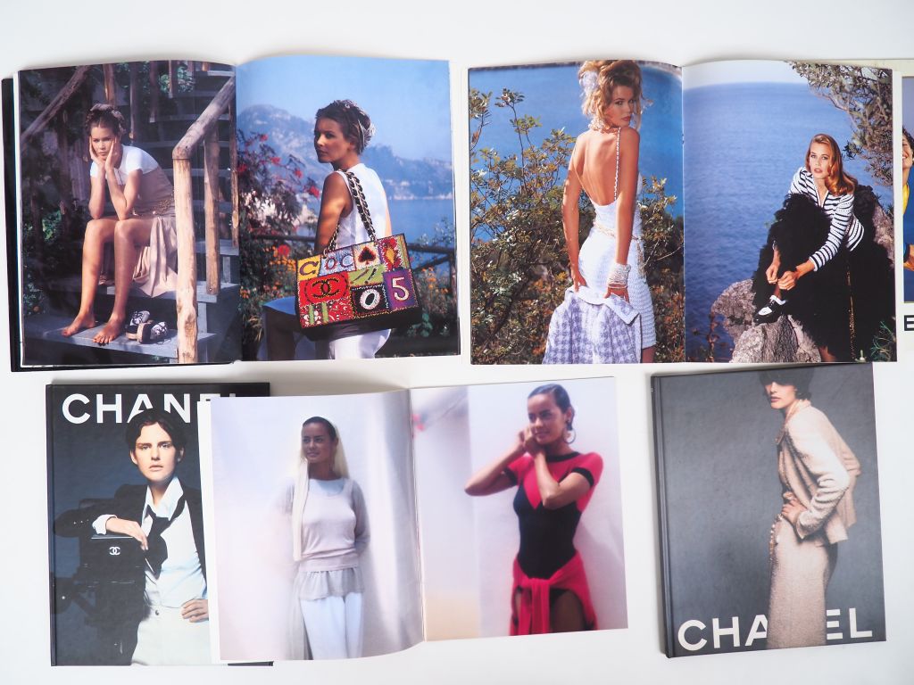 CHANEL, Boutique Sept catalogues photographiés par Karl Lagarfeld. Comprenant : - Collection Printemps/Eté 1991 - Collection Printemps/Eté 1992 - Collection Printemps/Eté 1993 - Collection Automne/Hiver 1993-1994 - Collection croisière 1993-1994 - Collection Automne-Hiver 1996-1997 - Collection Printemps/Eté 1997