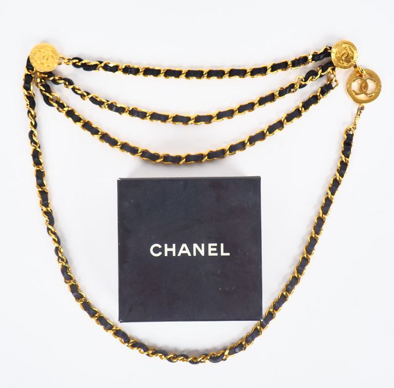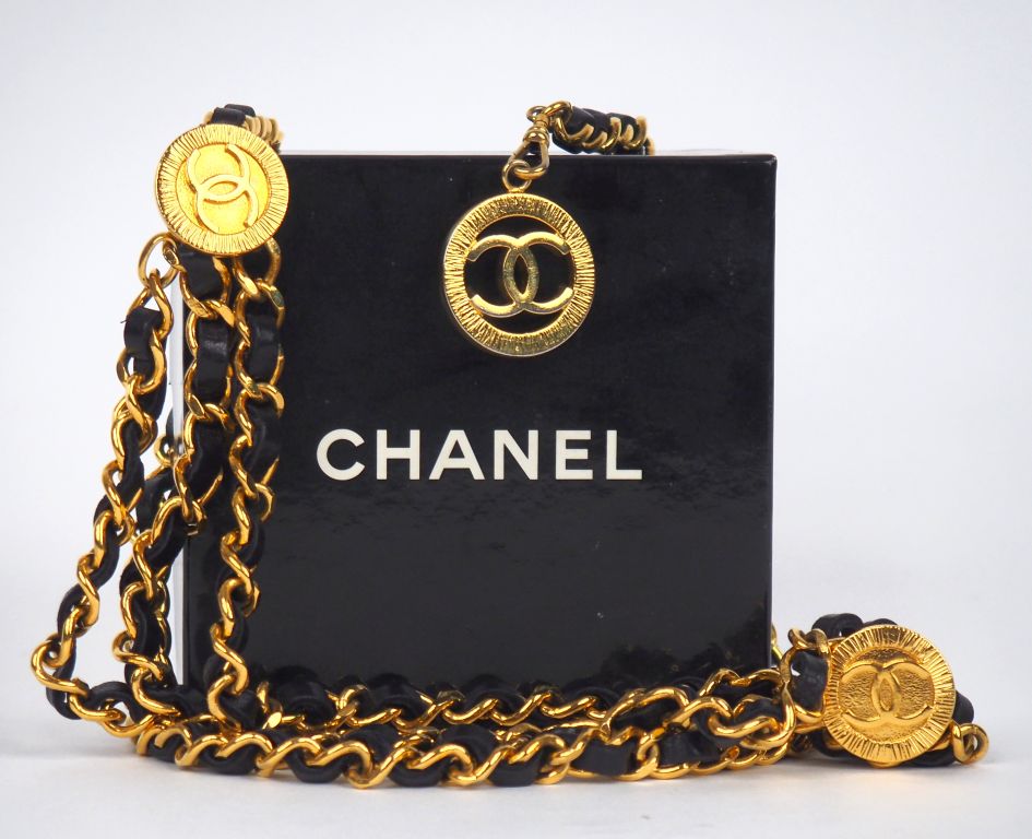 CHANEL, Paris Ceinture chaine à maille gourmette en métal doré entrelacée de cuir noir. Signée. Dans sa boite.
