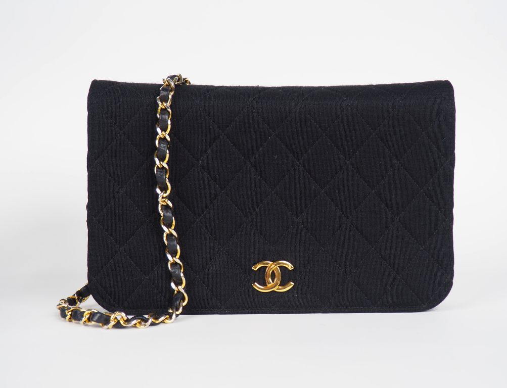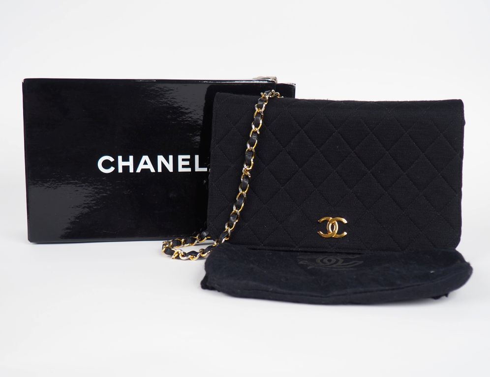 CHANEL, Paris Sac porté épaule en jersey matelassé noir. Garniture en métal doré. Fermeture à rabat et pression ornée du monogramme de la Maison. Intérieur cuir bordeaux, un poche à zip. Anse chaine en métal doré gainée de cuir. 15 x 24 cm Signé. Avec un pochon, dans sa boite d'origine. (état d'usage a l'extérieur, interieur abîmé, fermeture à revoir, boite légèrement abîmée)